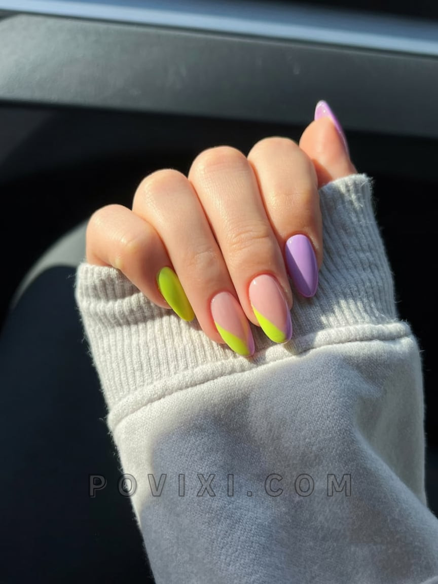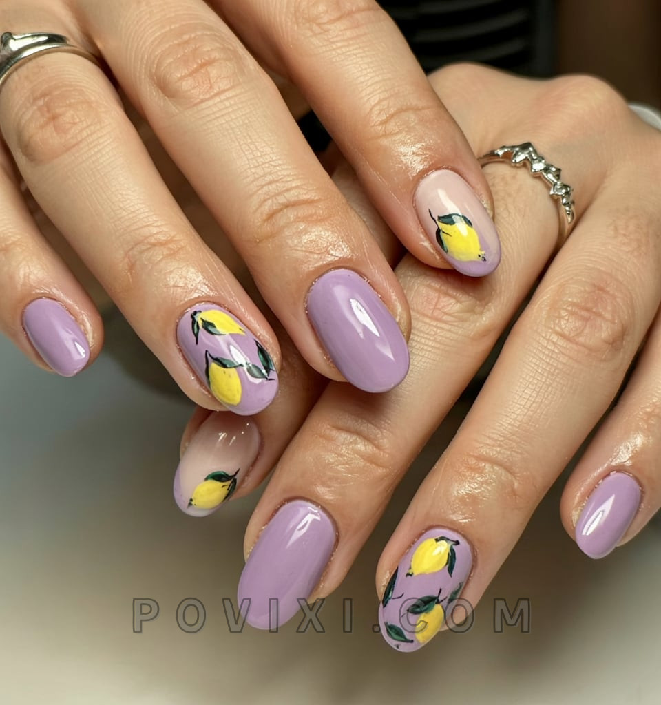 The 2025 image showcases the softness of almonds through an enchanting lavender-yellow combination that evokes the experience of drinking lemonade at sunset. Two accent nails feature lemon motifs that add elegance and excitement to this lilac-based design with their chic pastel color scheme. A free-spirited mood and carefree nail designs characterize these nails that work beautifully whether you choose picnic outings or summer events.