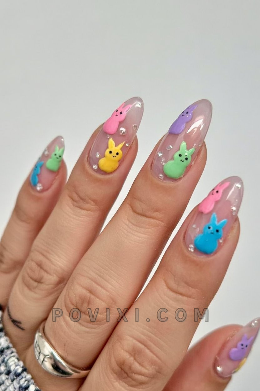 These acrylics take the prize for whimsical elegance among the designs listed due to their rich color patterns and cheerful appearance. The oval-shaped set features a translucent base with pastel bunny silhouettes ranging from mint to magenta, fully embracing the funky styles of 2025. The acrylics are elongated in length while remaining modest in size, making them practical to use. These acrylics are perfect for theme parties or for someone who wants to express their happy nature.