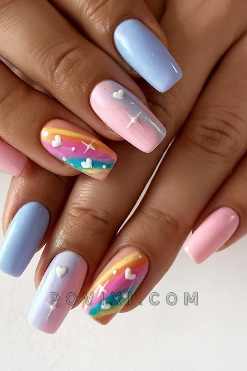 This collection of nails perfectly embodies the summer aesthetic that would appear on any mood board. These nails feature dreamy pastels that seamlessly transition into vibrant stripes with white hearts running through the entire design to create pure joy. The distinctive nail design is rectangular and square with enchanting features that evoke the sentimental style of diary embellishments. People should wear these nails during holidays or joyous personal celebrations such as Pride Month and Fourth of July celebrations and ordinary life celebrations. These nails are both elegant in design and fun because of their trendy and cute character.