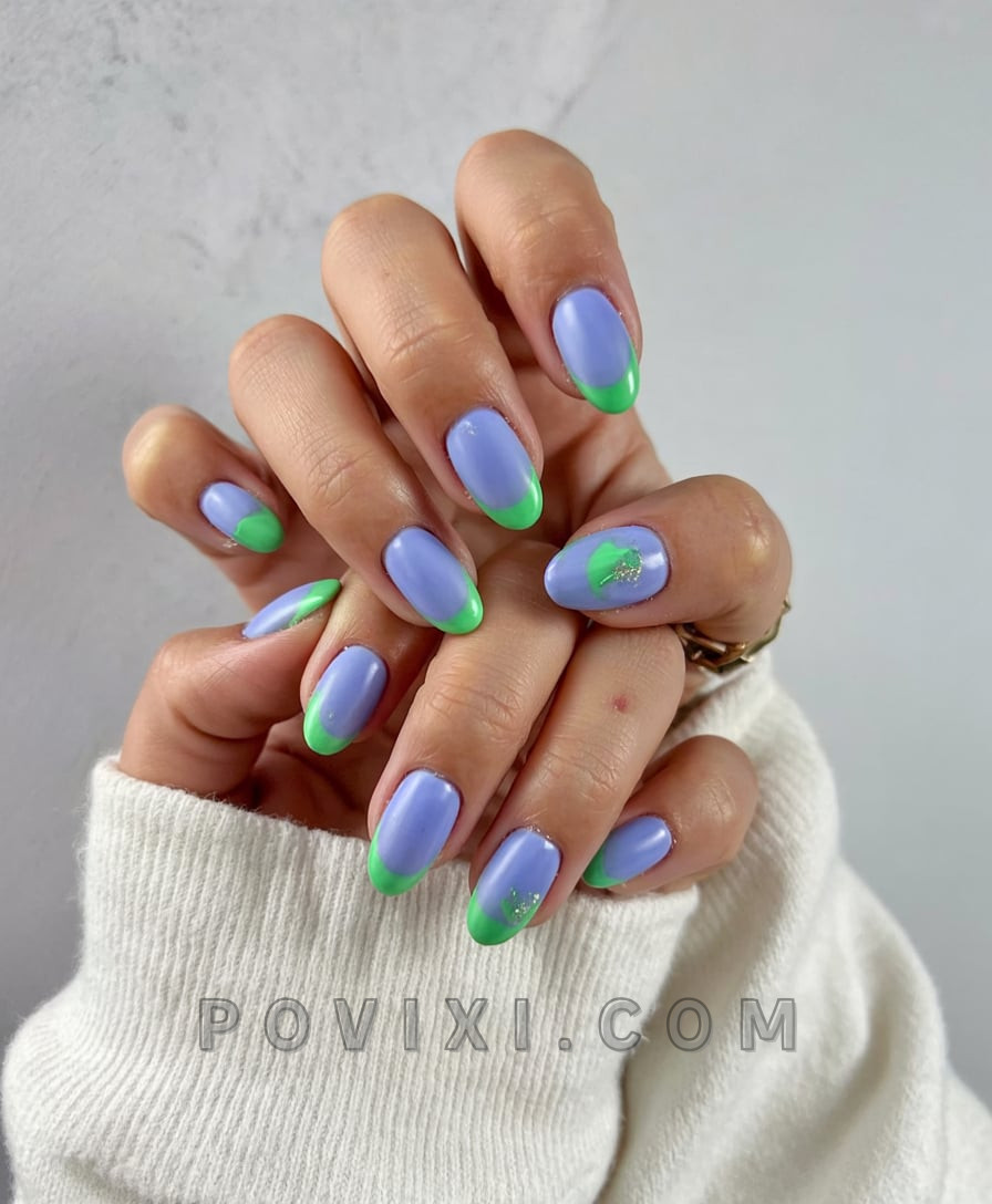 This manicure features a matte lavender squoval base that meets vibrant neon green tips. Glitter and tiny dots within this manicure add a touch of character without disrupting the look. The combination works well for people who need an office-appropriate look during the day, but still want a fun nighttime look. This color combination offers solid style and boldness to complement any outfit for a fashionable look.