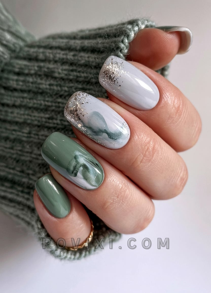 This glamorous nail design in elegant shimmering sage green is for those who want a sophisticated look. The marbled ombré of white and silver joins the rich sage green base color before glitter tips are added for accent. The motif is reminiscent of natural elements where foam meets eucalyptus leaves. This contemporary square design creates an eternal appeal, yet the glitter component transforms it into holiday-ready nails. The outfit complements this style with light cotton fabrics that can include a maxi dress flow.
