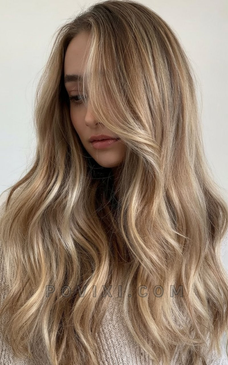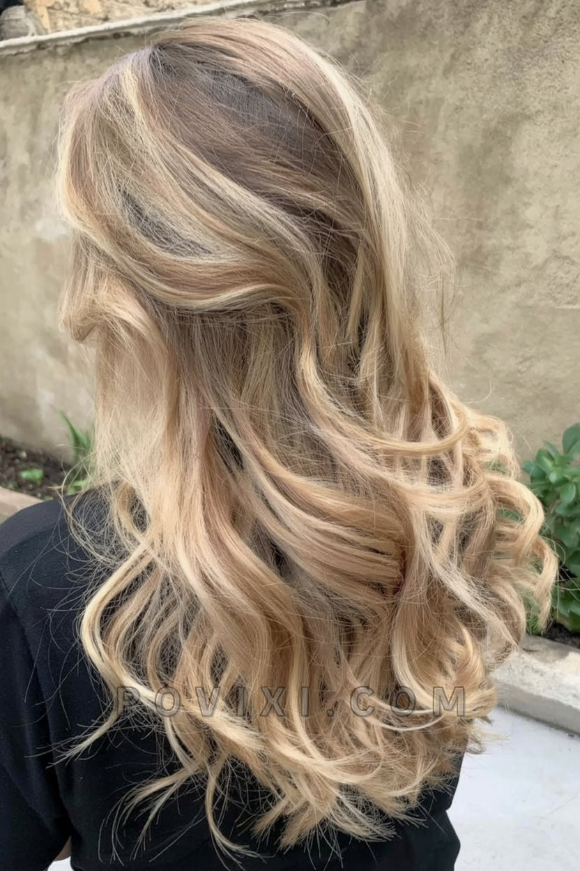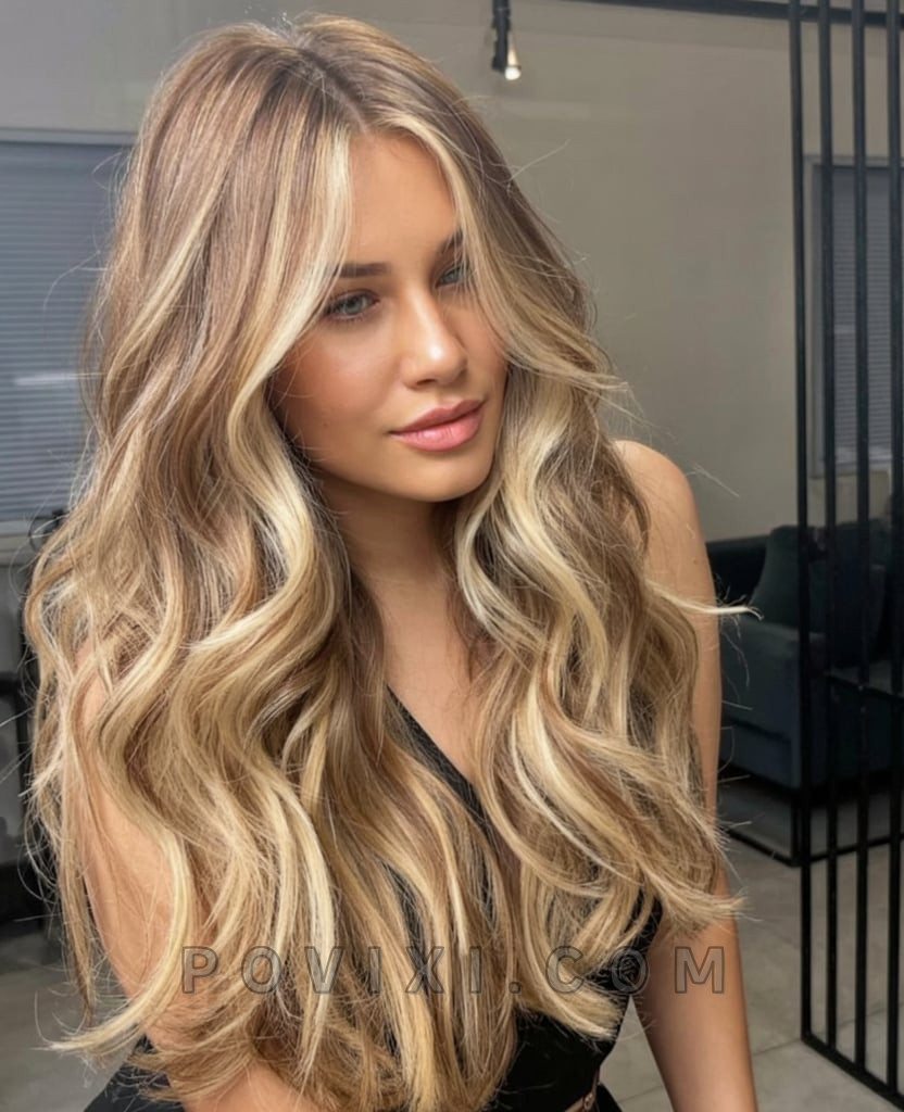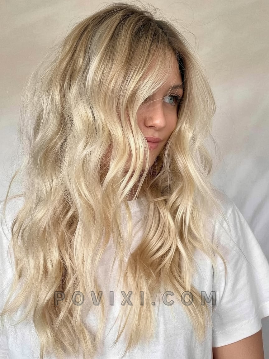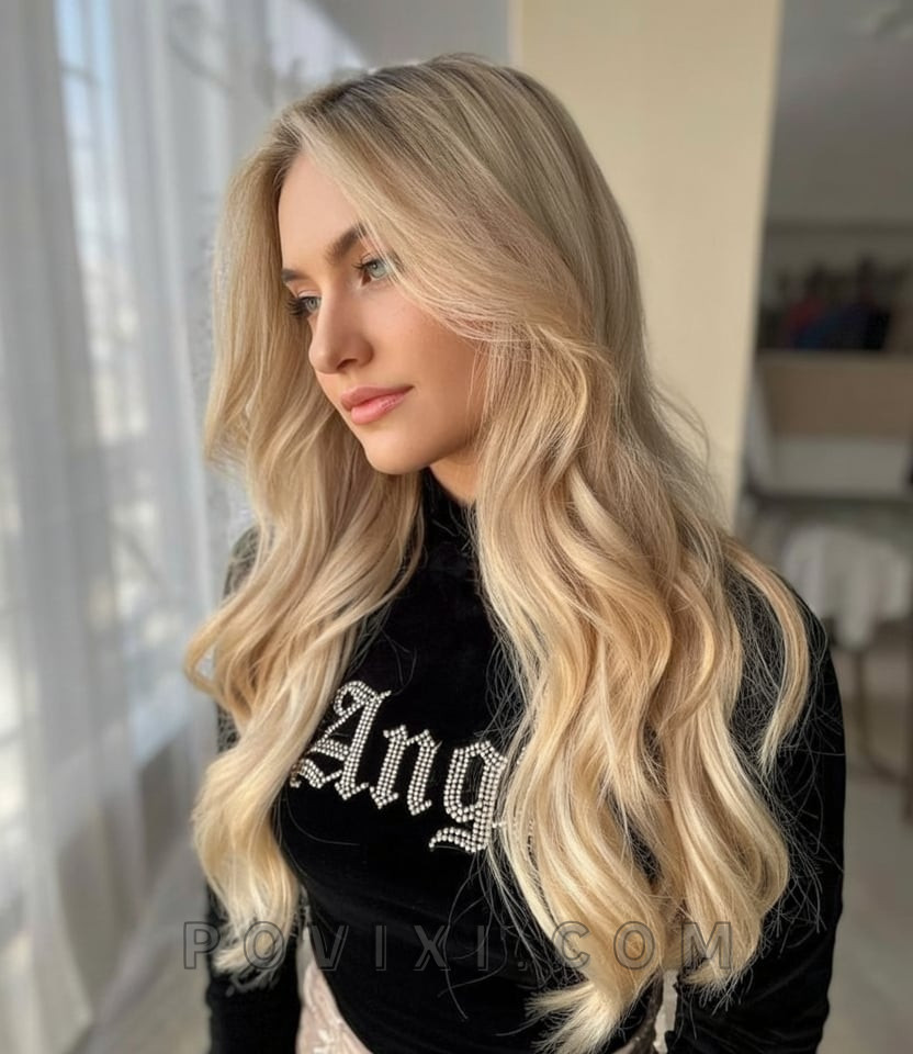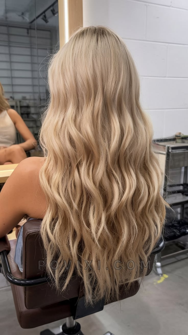 Cool and creamy blonde highlights cascade through ultra-long waves, giving this look a dreamy, fairy-tale appeal. It’s light, romantic, and ultra-feminine—ideal for women planning summer getaways or photoshoots. The soft transition at the root makes this platinum-like hue more wearable while maintaining that bright aesthetic. Pair it with soft pastels or summer whites for an angelic finish.