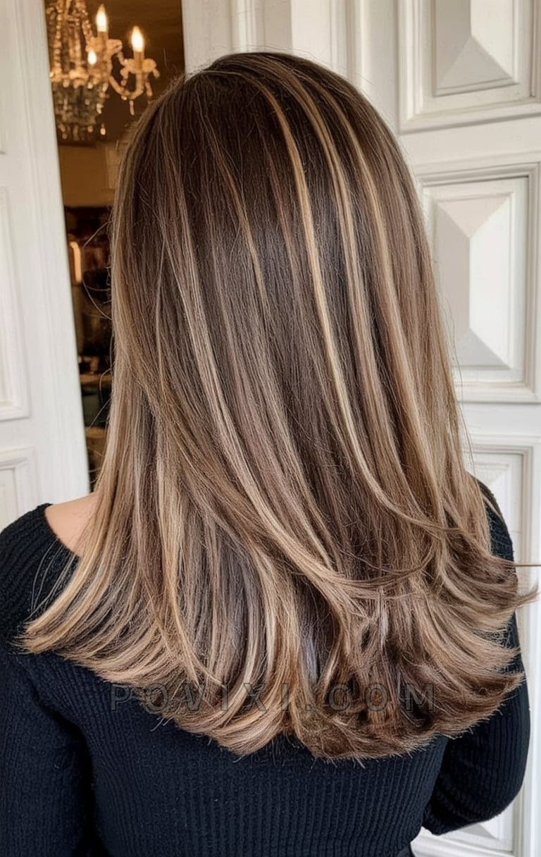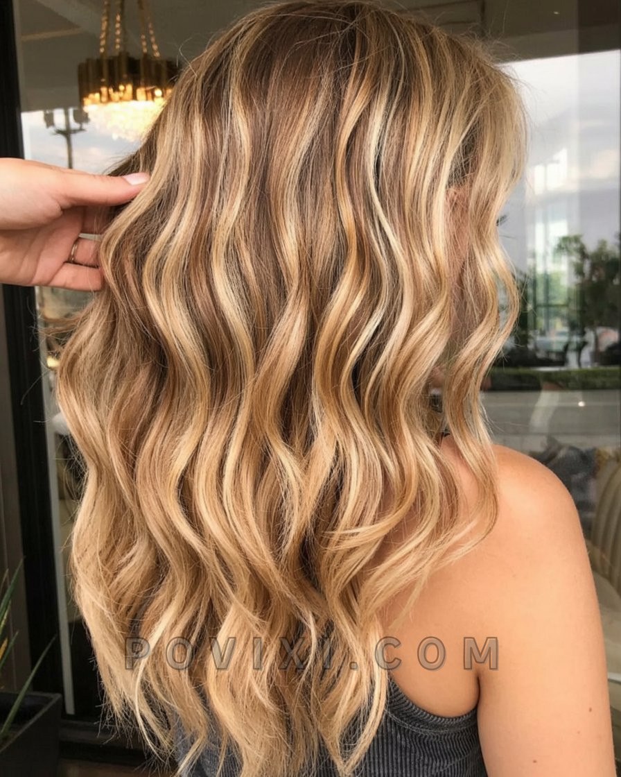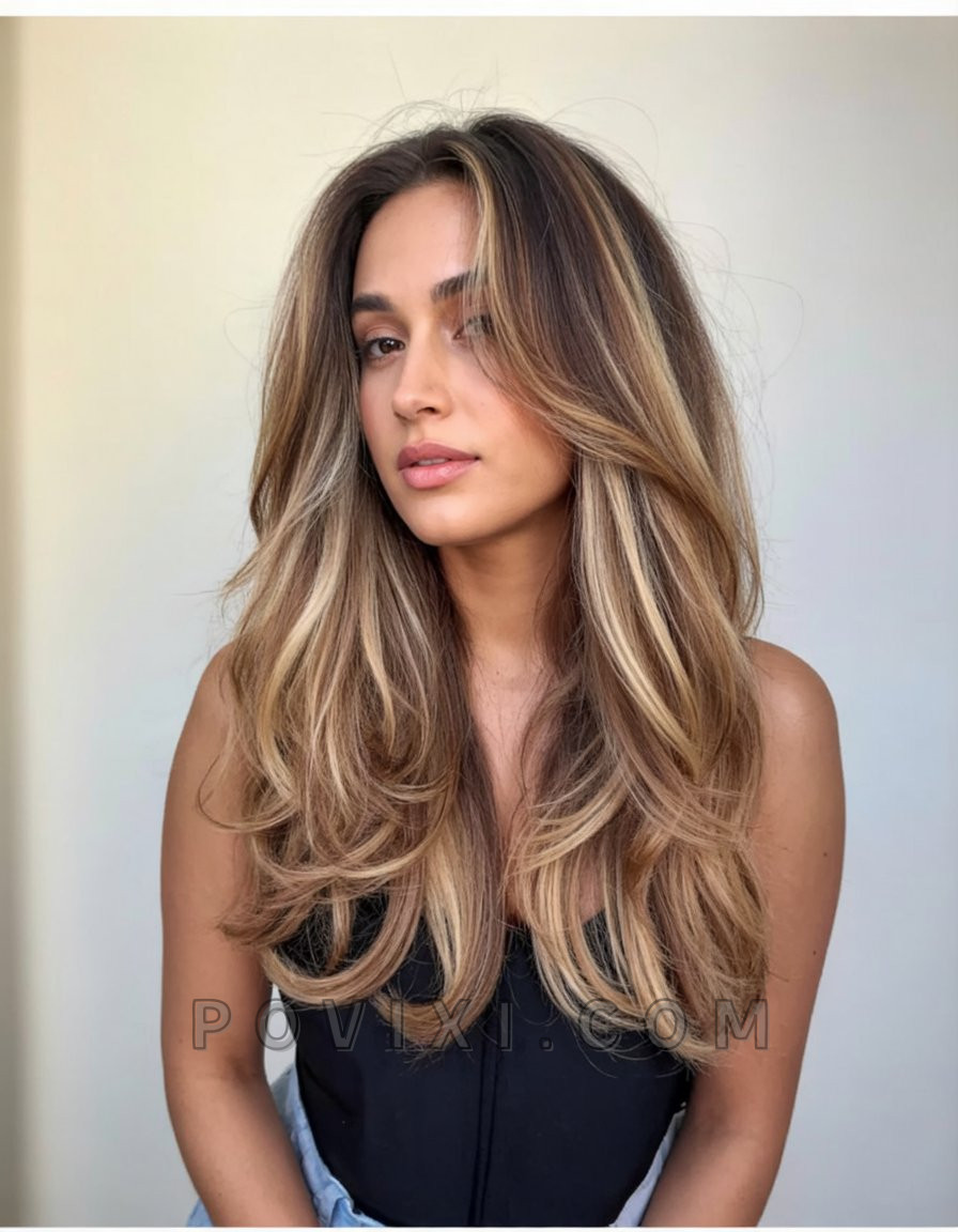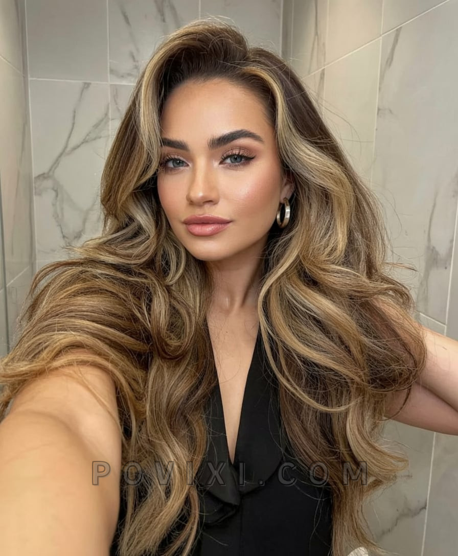 For women who lean into warmer tones, this richly blended style delivers. The honey brown hair base plays beautifully with golden highlights and lowlights, enhancing the texture of the waves. This is an approachable and flattering option for medium to dark brown hair, offering depth without stark contrast. Whether worn with soft waves or pinned back, this is a glow-up that suits sun-kissed skin and flowy sundresses.