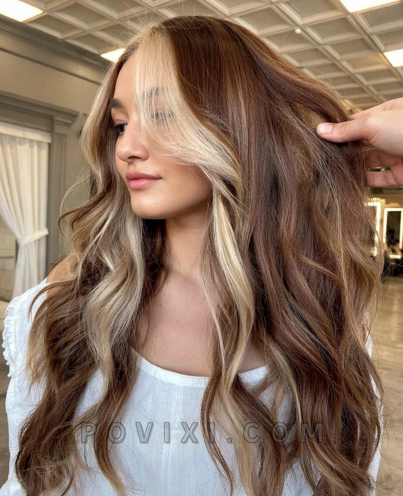 One of the boldest looks in the lineup, this high-contrast combination merges warm chestnut tones with thick, platinum blonde face-framing pieces. It’s striking and expressive—ideal for women ready to take risks and make a statement. Paired with soft curls and a side part, this style is a playful nod to early 2000s hair trends reimagined for 2025, perfect for a fun date night or music festival fit.