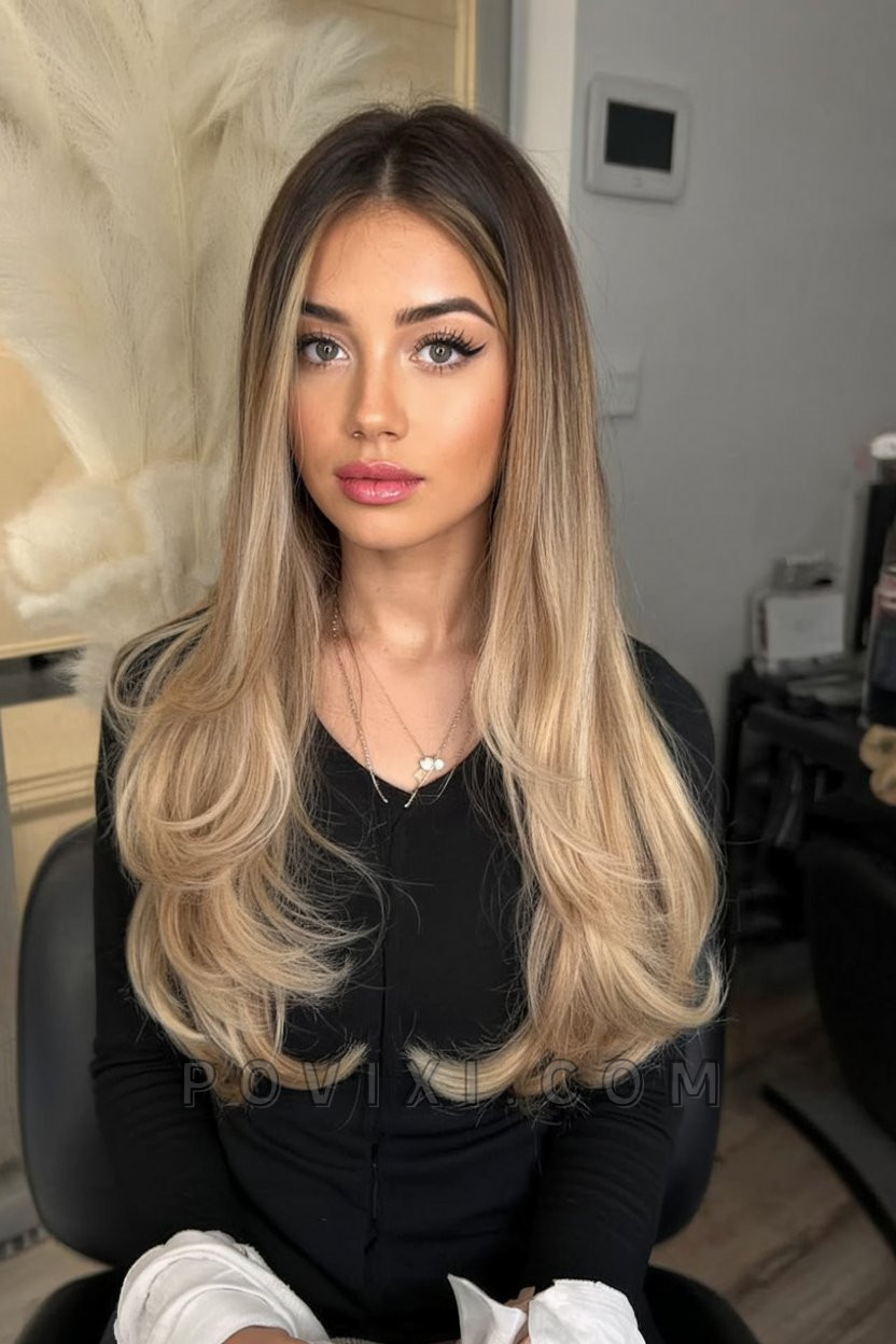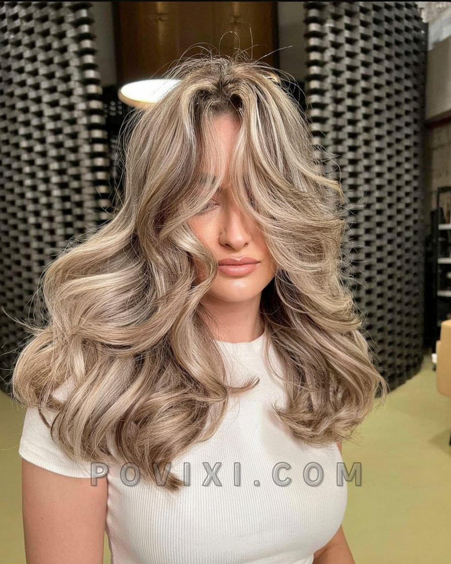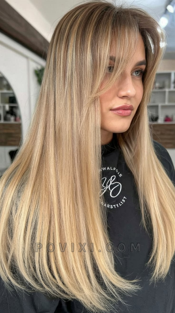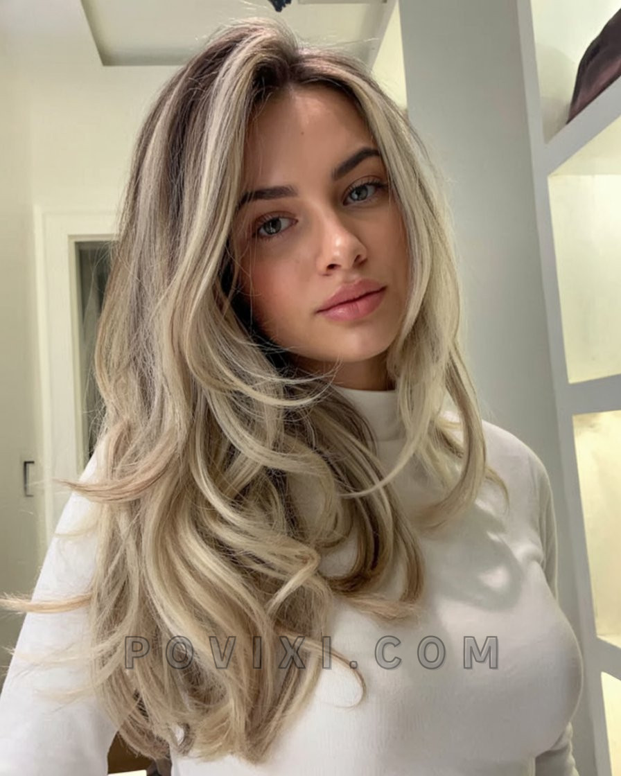 There’s something endlessly graceful about this style. With sweeping, layered ends and a dimensional blonde tone that mixes honey and ash hues, it creates a soft frame around the face. Ideal for women with straight hair looking for a voluminous yet natural look, it pairs beautifully with light makeup and a neutral-toned wardrobe. The look is youthful yet elegant—perfect for warm days and sunlit evenings. It also flatters those with brunettes ash brown roots wanting a transitional look for 2025.