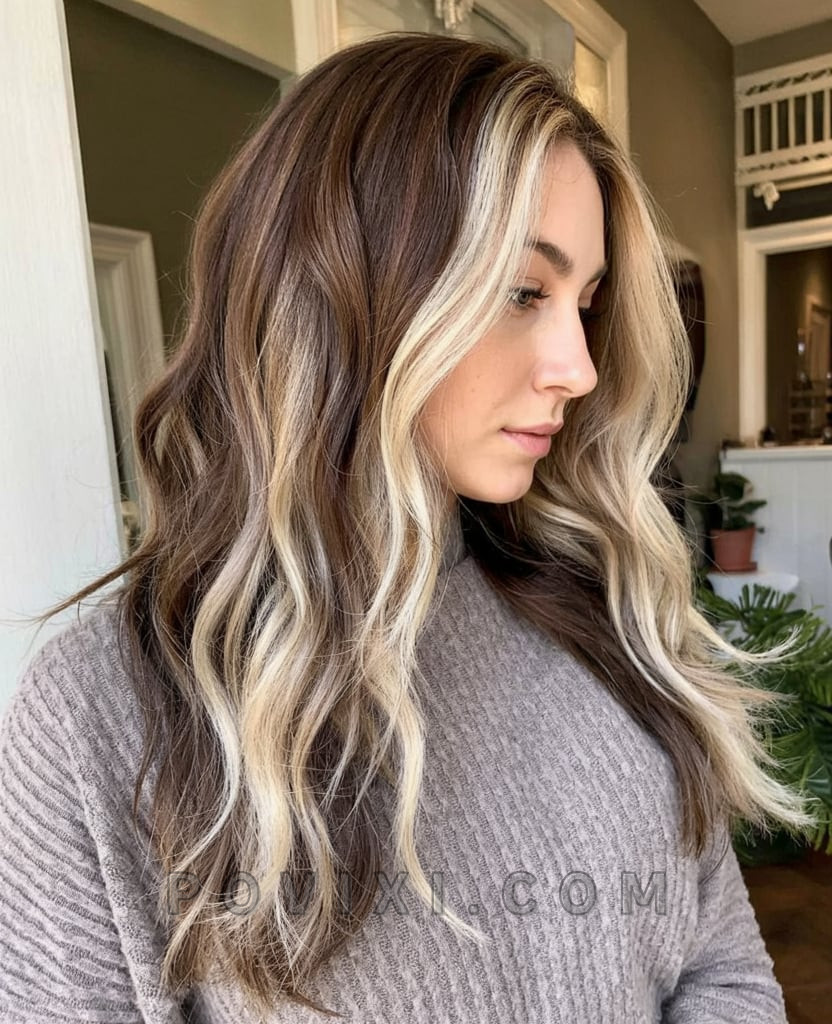 Serving drama in the best way, this style makes platinum streaks the star of the show. The high-definition blonde panels offer maximum contrast against the brunette base, drawing attention to the eyes and cheekbones. This is the look for women who want to stand out and express their confidence without saying a word. Go big with volume—hot rollers or a volumizing mousse will give you that luxe, blowout feel. Works best for evening events or girls’ night out.