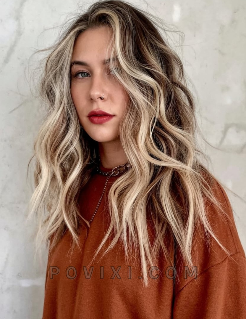 This look brings together lived-in texture with striking brightness. The rooty base transitions into sweeping sun kissed and bright tones, making it ideal on brown hair with a bohemian edge. The mix of tones and the textured haircut create movement and dimension that feels bold yet wearable. It’s perfect for those embracing the “cool-girl” undone vibe that’s huge in 2025.