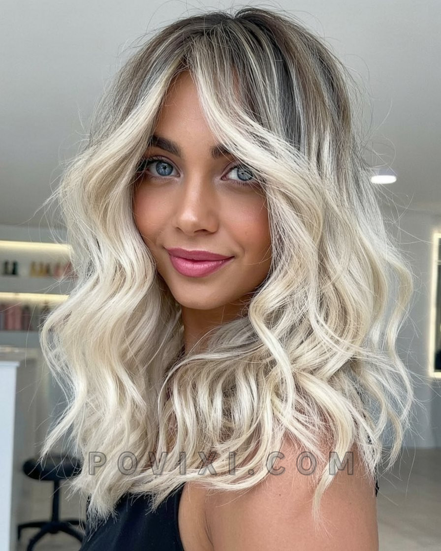 For women who prefer short hair, this lob with platinum tones is a bold statement. The shadowed roots add necessary contrast, giving structure to the icy, almost ethereal lengths. Styled with tousled waves and a middle part, it’s trendy yet wearable—ideal for fashion-forward women navigating work meetings, brunches, and summer getaways. A dream pairing with a black jumpsuit or clean-cut blazer.
