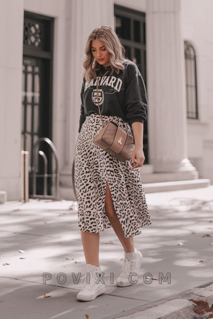 For moms who love a trendy yet relaxed look, pairing a statement sweatshirt with a casual midi skirt is a perfect mix. The bold Harvard print sweatshirt offers a laid-back feel, while the slit leopard-print skirt adds a touch of sophistication. This look is ideal for a casual midsize mom who wants to be stylish yet comfy while running errands or grabbing coffee. White high-top sneakers complete the outfit, making it easy to move around while staying on trend. Elevate this look with a crossbody designer bag and minimal jewelry for an effortlessly cool, city-chic vibe.
