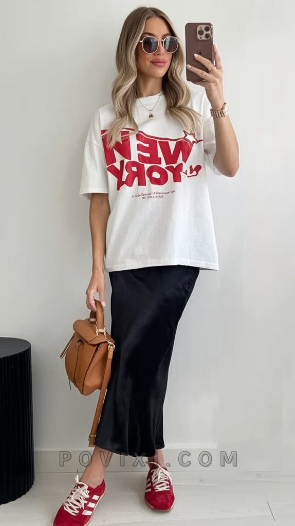 For a bold but casual midsize look, a satin midi skirt worn with an oversized New York graphic tee is a winner. This blend of dressy and relaxed pieces makes it a versatile outfit, great for hot weather outings, casual workdays, or even casual wedding guest attire. Red sneakers add a pop of color and keep the look fun. A structured handbag brings balance to the oversized elements of this outfit.