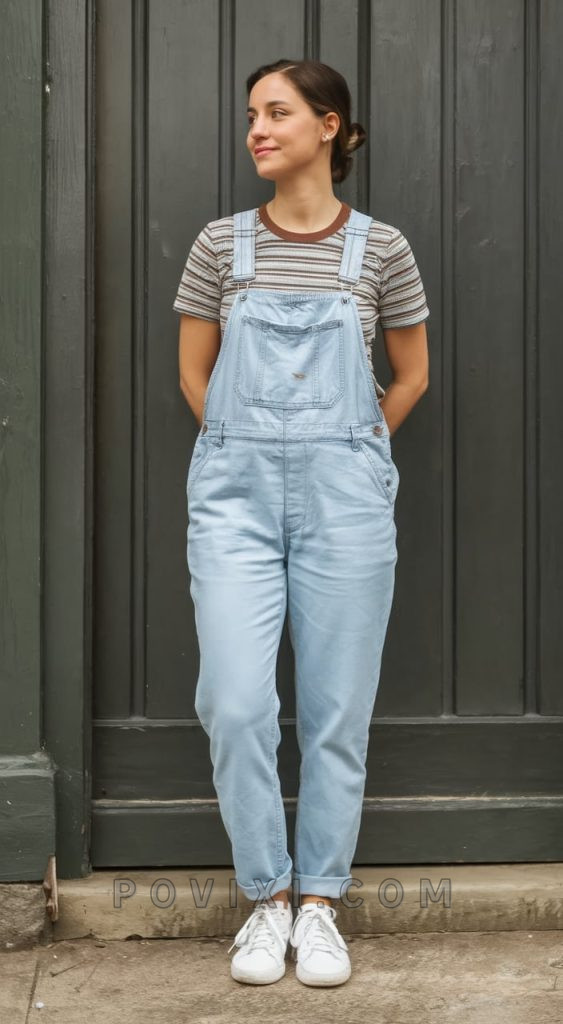 Denim overalls are making a casual 2025 comeback, and for good reason—they’re practical, versatile, and effortlessly stylish. Paired with a striped fitted tee and comfy white sneakers, this look is perfect for busy moms on the go. Whether you’re dropping the kids at camp or heading to brunch, this outfit ensures you stay comfortable while looking chic. Pro tip: opt for a slightly cropped or rolled-up hem to keep the look trendy and modern. Layering with a lightweight linen shirt can elevate the look, making it adaptable for cooler evenings.
