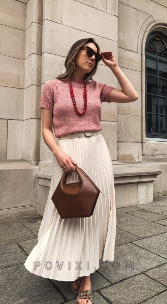 A simple pleated skirt paired with a soft knit top is a great occasion outfit for summer events like a wedding or an evening dinner party. The structured yet flowy skirt balances elegance with ease, while the blush-toned top adds a feminine touch. Accessorized with a statement necklace, a modern handbag, and slip-on sandals, this look is both trendy and easy to wear. To add more versatility, consider swapping the top for a lightweight linen blouse or a fitted tank for a more relaxed feel.