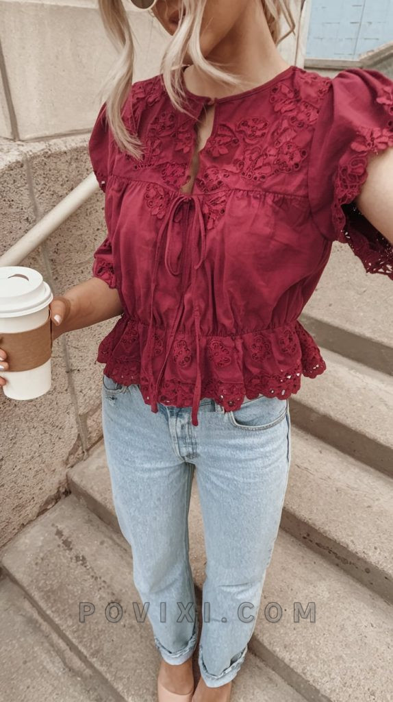 A casual midsize outfit with a romantic touch, this pairing of a deep red lace top with light-wash denim jeans exudes effortless charm. The intricate lace details make it suitable for both a birthday party or a casual summer dinner. Pair it with nude ballet flats or strappy sandals for a simple yet chic look. You can also add a woven handbag or a pair of gold statement earrings to complete the outfit.