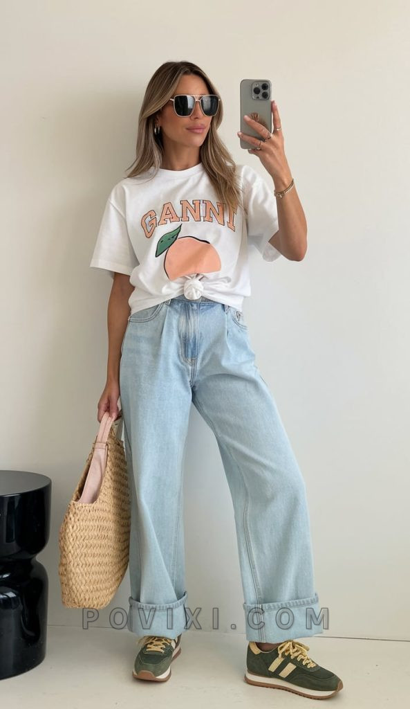 Graphic tees are an essential for casual midsize wardrobes, and pairing one with wide-leg jeans creates the perfect casual simple look. This outfit, styled with sporty sneakers and a woven tote bag, is perfect for summer days filled with errands, playdates, or weekend strolls. Knotting the tee at the waist gives it a structured look while maintaining easy comfort. Opt for pastel or bright-colored graphics to give the look a fresh and vibrant feel.