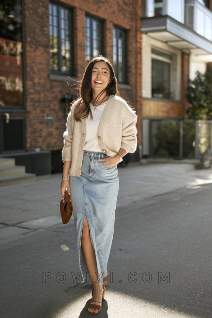 Denim skirts are back in full swing, and this long-line, front-slit version is ideal for a spring-to-summer transition. Paired with a light cardigan and a fitted tank, this outfit is trendy, polished, and perfect for a birthday party or an occasion where you need to look effortlessly put together. Swap the cardigan for a lightweight kimono or a structured blazer to switch things up for different occasions.