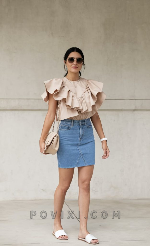 For moms who love a bit of flair, a ruffled neutral top combined with a classic denim mini skirt is a showstopper. This trendy summer outfit is ideal for brunch, an occasion, or even a wedding reception when dressed up with the right accessories. Add minimal jewelry and comfy slides to keep it balanced. Swap the mini skirt for tailored shorts for a casual simple alternative.