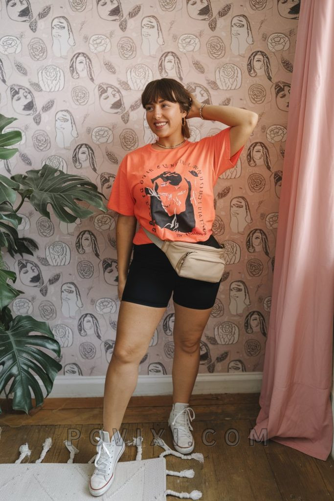 For a sporty and casual midsize look, biker shorts paired with an oversized graphic tee are an unbeatable combination. The bold orange hue makes it trendy and eye-catching, while the neutral crossbody bag adds a practical touch. This is an ideal outfit for moms who are constantly on the move, whether heading to the park or a casual gathering. You can also layer a lightweight jacket over the tee for an easy evening transition.