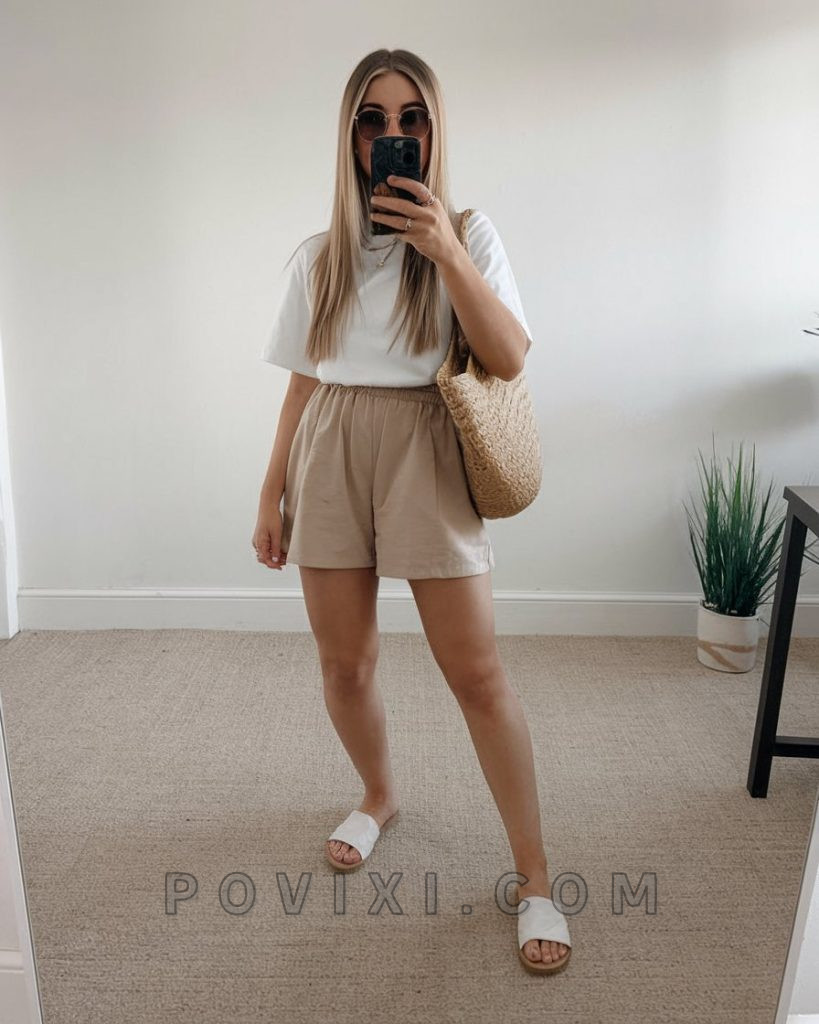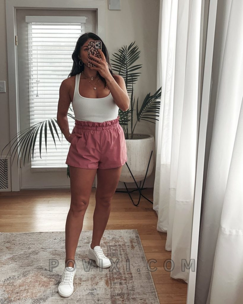 For moms who love casual midsize fashion with a pop of color, this outfit is a must-try. The fitted white ribbed tank top provides a flattering silhouette, while the high-waisted pink paper bag shorts add a cute and feminine touch. Paired with white sneakers, this look is perfect for brunch, a quick shopping trip, or even a birthday outing. High-waisted shorts have become a staple in the casual 2025 wardrobe as they provide coverage and style without compromising on comfort. This look also offers great versatility—you can dress it up with some gold accessories or keep it minimal for an everyday vibe.