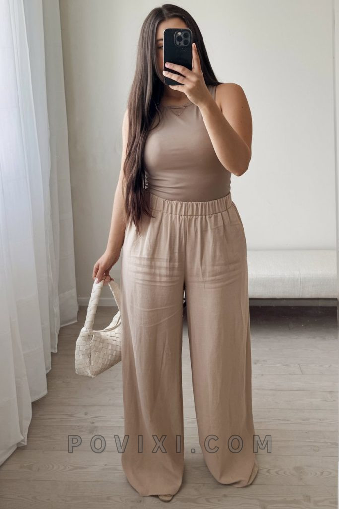 For moms who love casual 2025 style with a plus size-friendly fit, this look is all about elegance in simplicity. A beige fitted tank top tucked into wide-leg neutral trousers creates a breezy, effortlessly stylish summer outfit. The woven handbag adds texture, making this outfit perfect for a wedding or a relaxed spring event. Minimalist fashion continues to reign in 2025, focusing on clean lines, neutral tones, and quality fabrics. This look embodies all three, offering a comfy yet polished style perfect for warm-weather gatherings.
