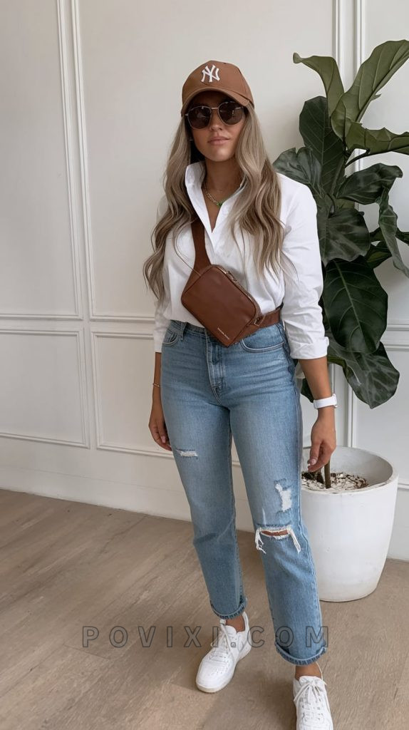 This easy classic look is a must-have for every mom’s wardrobe. A crisp white button-down shirt paired with high-waisted ripped jeans creates a casual simple yet sophisticated look. The brown leather crossbody bag and baseball cap add a trendy 2025 sporty twist, making it ideal for anything from school drop-offs to birthday brunches. Denim and white shirts are timeless fashion pieces, ensuring that you’ll always have a casual midsize outfit that feels fresh and polished.