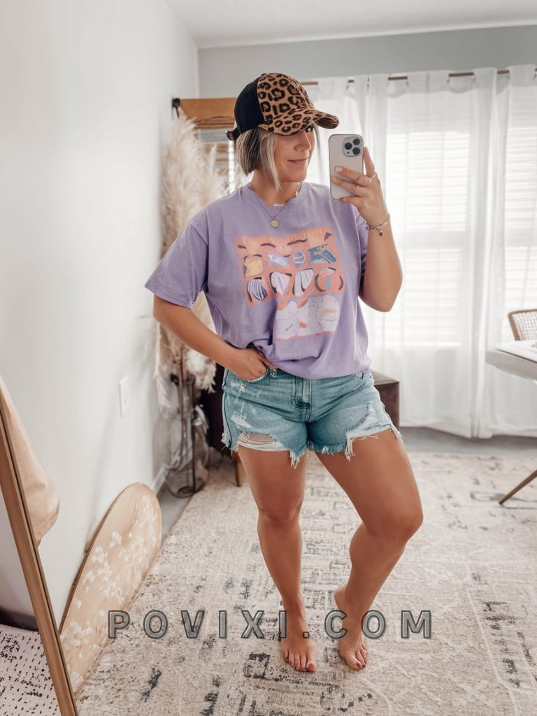 Nothing beats the combination of casual shorts and a relaxed tee for a hot summer day. This look features a purple oversized graphic tee, distressed denim shorts, and a leopard-print trucker hat—a mix of playful and trendy 2025 mom fashion. Whether you’re heading to a party or running errands, this outfit is both practical and stylish.