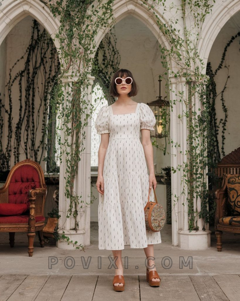 For moms looking for a dressier spring or wedding look, this puff-sleeve midi dress with subtle prints is a dream. The square neckline and tiered skirt add a romantic, vintage-inspired touch. Pairing it with platform sandals and a round embroidered bag gives it an extra level of cute charm. Perfect for a birthday party, brunch, or outdoor summer event, this is a trendy choice that will have you feeling graceful and comfortable. Wear your hair in soft waves and add oversized sunglasses for an effortlessly glamorous finish.
