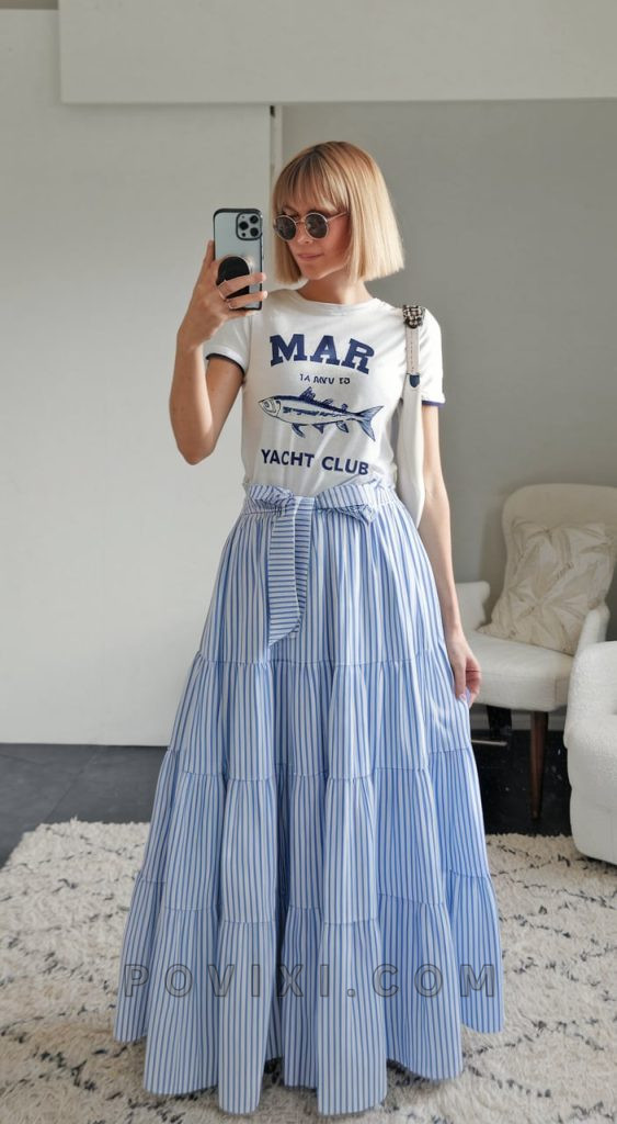A striped blue maxi skirt with a cinched waist pairs beautifully with a tucked-in graphic tee. The midsize design of the skirt flatters all body types while the casual t-shirt keeps the look relaxed. For moms who want a trendy yet wearable style, this outfit is perfect for casual Fridays, seaside strolls, or summer evenings out. Knot the front of your t-shirt to give the outfit a flattering shape and create a more defined waistline.