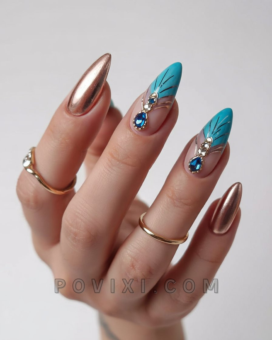 This design perfectly balances elegant rhinestones, chrome almond shape tips, and a splash of blue gradient that channels deep ocean waves. It’s luxury meets beach day—the kind of vacation nail art that turns heads on a yacht deck or at a fine-dining sunset dinner. The rich blue gemstones are a nod to both royalty and the Tropical waters of a luxury resort—ideal for a wedding guest or anniversary trip.
