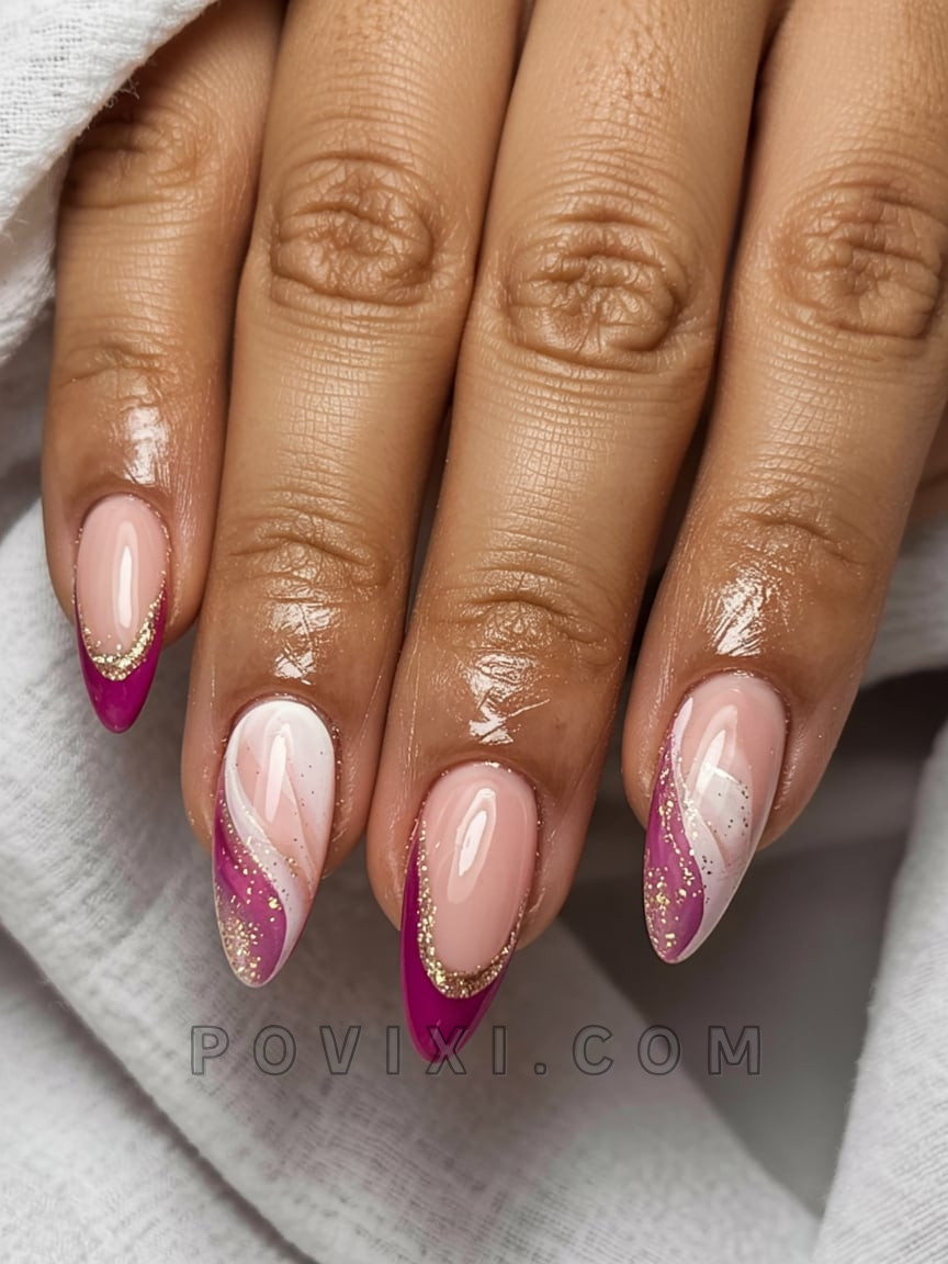 These acrylic nails elevate the classic French mani with curvy fuchsia tips outlined in fine gold glitter. It’s a romantic, elegant option perfect for destination weddings, anniversaries, or even a birthday spa retreat. The wave design mimics gentle water motion—perfect for an ocean backdrop. Shorter length makes this suitable for travelers who prefer a clean look that still feels festive.
