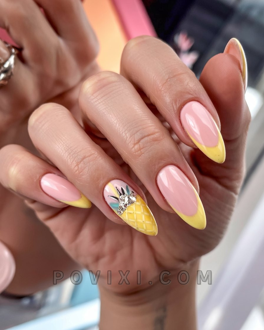 This sweet take on the classic French tip adds a slice of fun—literally. Soft yellow tips frame a juicy 3D pineapple design with sparkling rhinestones, bringing immediate tropical vibes to your look. It’s chic but light-hearted, and the almond shape makes it feel effortlessly modern. Ideal for a beach Mexico getaway or a casual summer picnic, this design pairs perfectly with sundresses and oversized sunnies. Plus, the pastel base adds a touch of elegant balance to all that fruity flair.