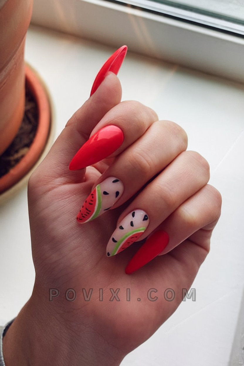 This design is as refreshing as it looks. Featuring juicy watermelon slices complete with tiny black seeds, this vibrant look combines glossy red with nude and green for the ultimate summer snack-inspired nail set. The elongated almond shape adds drama, while the playful print keeps things fun and vacation-ready. Perfect for an outdoor BBQ, rooftop drinks, or even a spontaneous birthday trip with the girls. It screams Inspo for anyone who lives for bright, high-contrast color blocking.