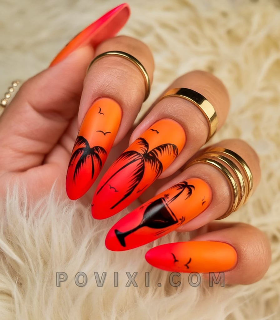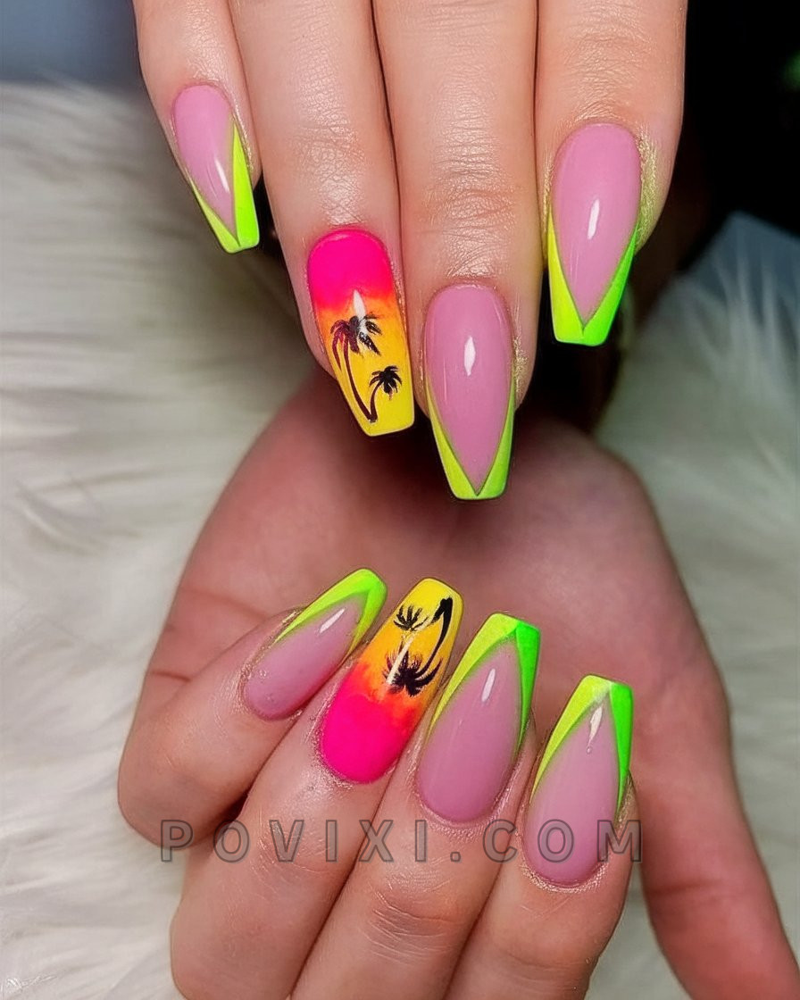 Say hello to your dream tropical island sunset. Neon yellow, coral, and hot pink gradients melt into each other behind soft palm tree silhouettes. This is a square shape design made for bold personalities and beach bar queens. The edgy V-shaped French tips keep things graphic and contemporary. Whether you’re planning a trip to Miami or Italy’s Amalfi coast, these nails are your cocktail-hour-ready companions. Trendy, loud, and made for golden hour.