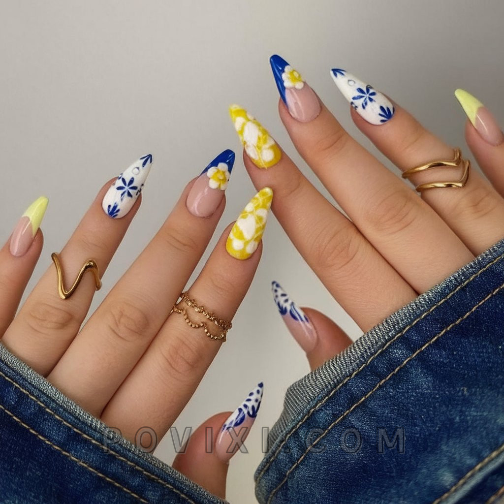 If you love combining elegant design with pops of color, this floral fantasy is for you. Royal blue, lemon yellow, and white form intricate painted blooms that feel like fine ceramic art. The almond shape is sharp yet feminine, and this look would be perfect for wedding guests or a long-weekend tour of vineyard estates. For the woman who favors refined travel experiences and high-end aesthetic touches, this is an absolute yes.