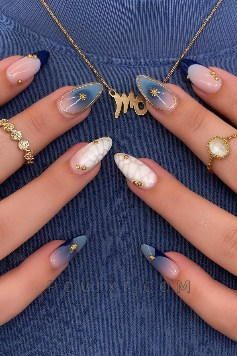 These mystical gel nails mix creamy marble whites with a calming blue gradient and delicate golden stars. The gold embellishments and cosmic symbolism evoke the feeling of staring up at a starlit sky from a luxury spa on an island. Ideal for dreamers and stargazers, this vacation nail design suits both Christmas winter getaways and summer rooftop nights. It’s classy, poetic, and quietly confident.