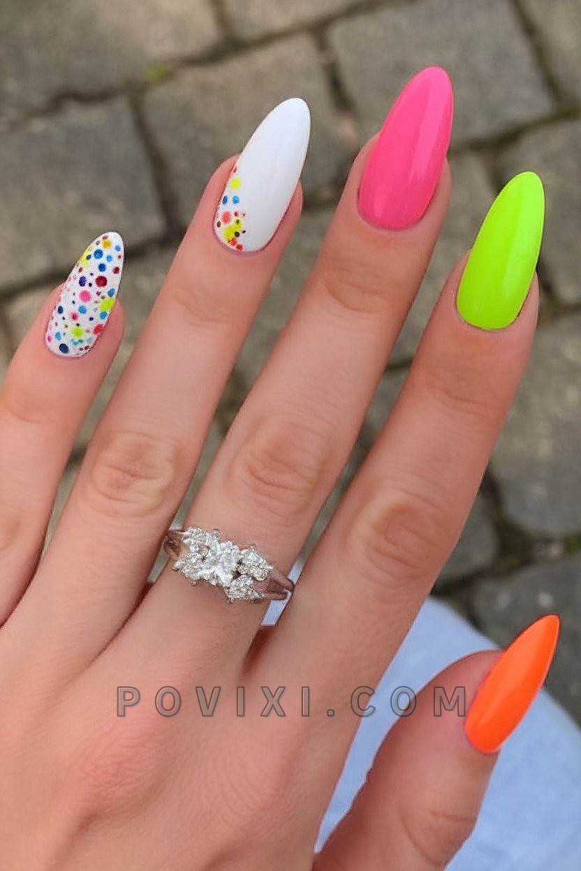 It’s your birthday, and your nails came to party. Vibrant neon shades—pink, orange, lime—blend with a festive sprinkle of rainbow dots over a clean white base. This fun and casual design is perfect for festivals, beach volleyball, or an impromptu trip to Las Vegas. If you love color and spontaneity, this set is pure inspiration and matches every outfit in your suitcase. Great for short vacations or last-minute plans.