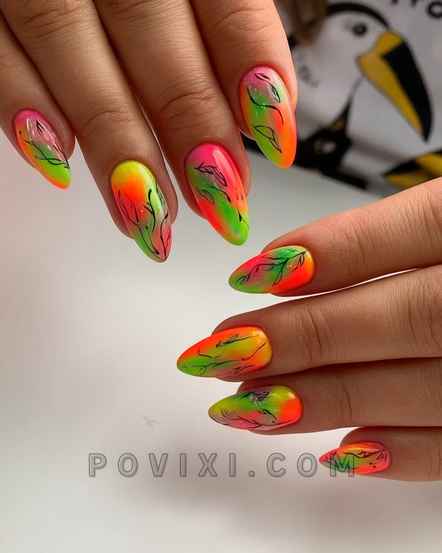 Channel your inner rainforest goddess with this glowing mix of electric pink, citrus, and lime. Subtle black leaf outlines add contrast and give the look a leafy, breathable finish. This is a manicure that pairs perfectly with bold swimwear, metallic sandals, and natural curls. It’s also an ideal pick for black women who love acrylic designs that make a statement. This look is fire for summer 2025, from jungle treks to beach clubs.