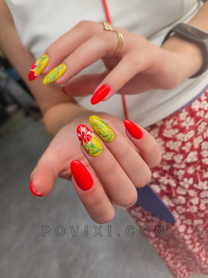 This look is all about balance—red polish adds bold energy while two accent nails serve serious tropical flower art. The yellow background mimics the glow of the sun, while hibiscus-style floral patterns speak directly to beachside daydreams. Think luaus, warm breezes, and pineapple drinks. This set is for the woman who wants color with elegance—something that pairs as easily with heels as with barefoot walks along the coast.