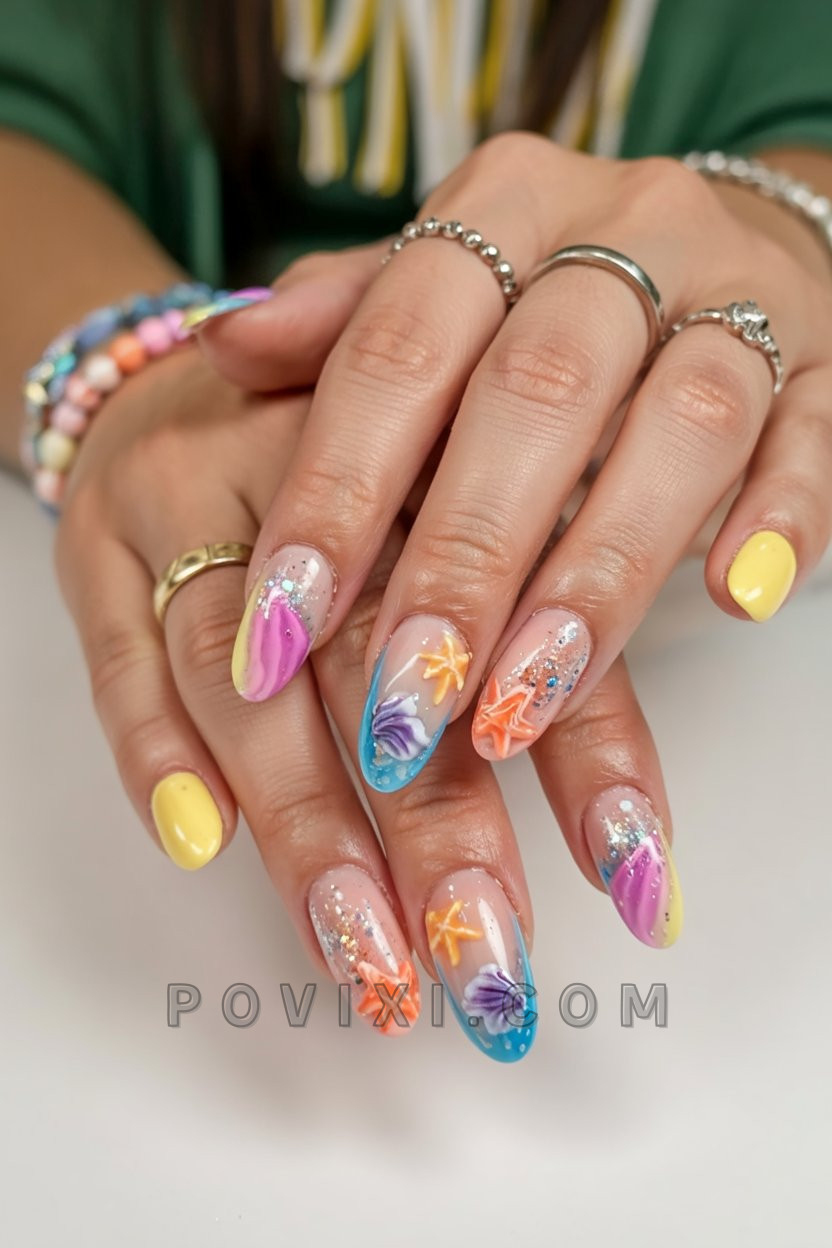 Ready for a beach bash? This set is an explosion of fun, featuring 3D sea creatures like coral-orange starfish, purple shells, and sunny yellow accents that practically scream vacation mood. Set against translucent pink with iridescent glitter, it creates a sense of underwater magic. Whether you’re walking through white sands in Mexico or planning a family birthday trip to a beachside villa, this look pairs well with bright bikinis, breezy kaftans, and a tropical drink in hand. The square nail type also gives extra room for playful detail while staying casual and easy to wear.