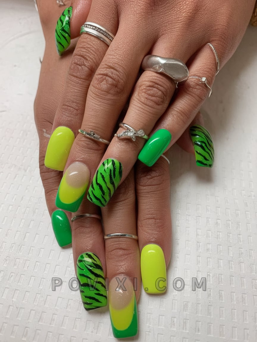 Ready to go wild? This square set brings in vibrant green and highlighter yellow with black tiger-stripe prints. The design is fierce, modern, and made for adventure—from jungle tours in Costa Rica to music festivals under the sun. Perfect for gel nails or dip nails, this bold look brings the energy of summer safaris and wild nights out. Pair with cargo shorts, oversized sunglasses, and that go-getter attitude.