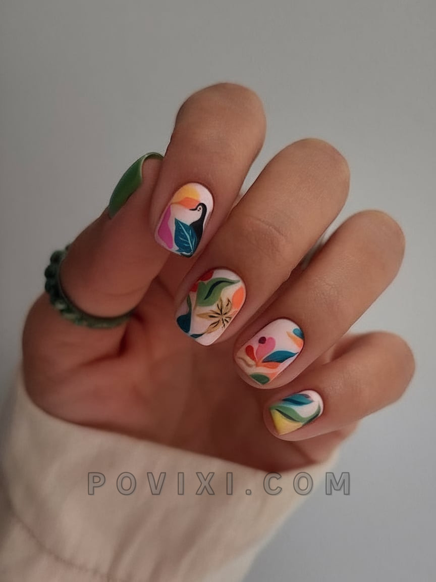 Bold, expressive, and bursting with tropical energy, this hand-painted nail design combines vivid leaf motifs and a minimalist toucan accent. The short nail length keeps the overall look playful yet practical for travel, especially if you’re heading to a beach Mexico resort or a sunny hike through the jungle. The base shade is a soft pink that allows the hand-drawn leaves and parrot-style illustrations to shine. The look blends artistic elegance with funky island vibes, making it a perfect choice for women seeking natural nails that still feel like a statement piece. Pair with breathable linen outfits or tropical prints for a fully coordinated vacation look.