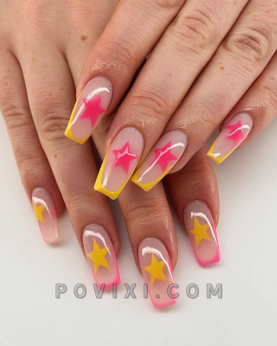 These square-shaped acrylic nails bring a trendy, energetic twist to your vacation wardrobe. Featuring glossy neon stars in yellow and pink, they channel a mood that’s equal parts nostalgic and futuristic—think early 2000s glam meets Y2K revival. Perfect for concert nights, beach parties, or even Halloween in the tropics, this design demands attention. Style them with bold sunglasses, mini dresses, or anything that sparkles. If your vacation includes nightlife, these nails are your ticket to edgy, unforgettable style.