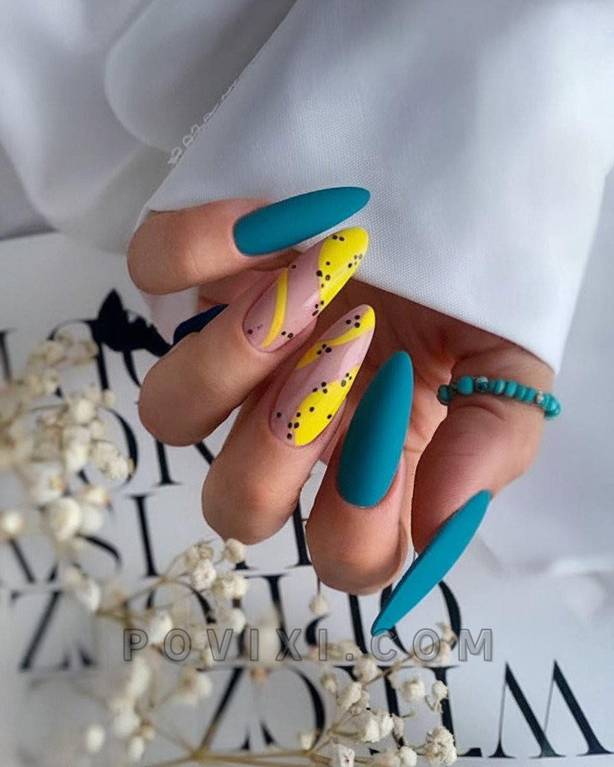 For those who like their nails as funky and playful as their vacation wardrobes, this combo of matte teal and banana-yellow abstract shapes is a winner. The asymmetrical pattern adds a splash of art-inspired edge, while the matte finish keeps it modern and trendy. It’s the kind of nail type you’d wear to a rooftop brunch, fashion week beach event, or even a birthday blowout. Mix and match with gold jewelry and statement swimwear for a bold vacation aesthetic.