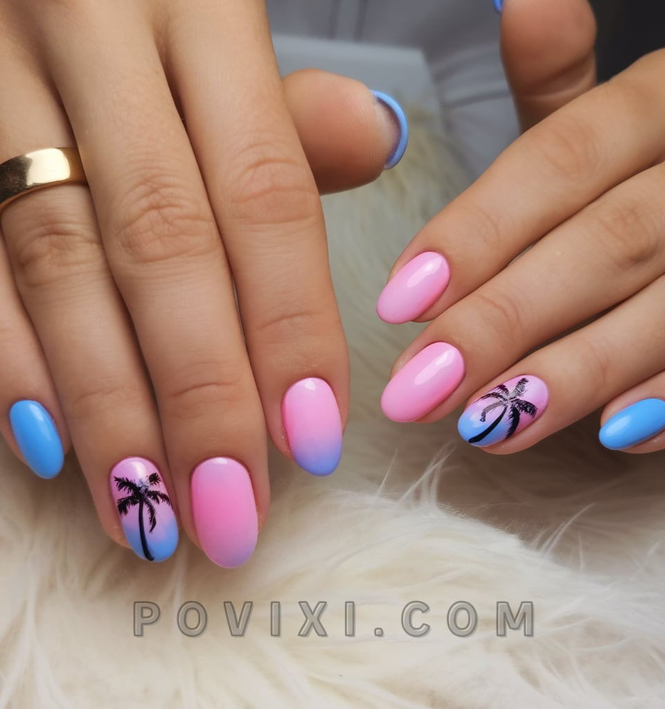 Blending dreamy ombré hues of blue and pink, this soft gel nail design features silhouette palm trees that evoke classic vacation postcards. It’s a gentle nod to spring or summer evenings spent watching the sky turn to pastels while waves roll in the background. Ideal for romantic getaways, natural nails fans, or anyone craving a relaxed aesthetic. These nails work great with casual sundresses, denim shorts, or even Christmas cruises if you’re traveling during the holidays.