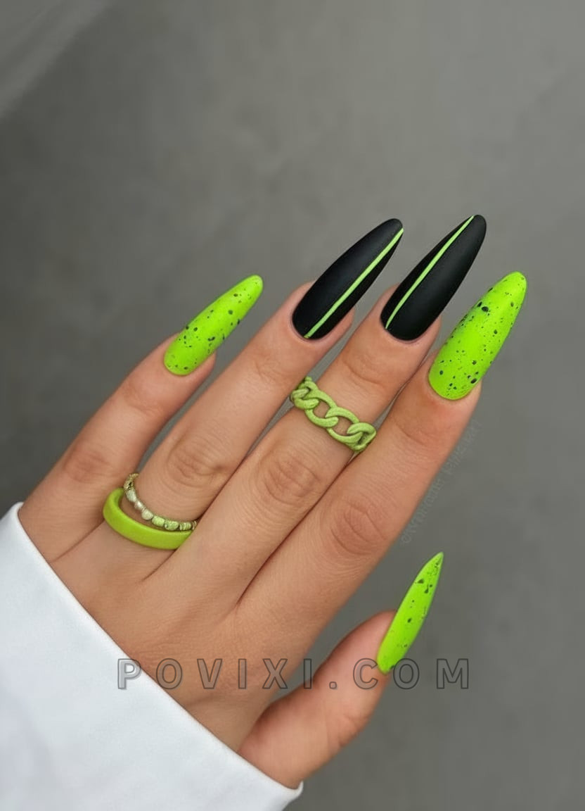 Looking for a bolder, edgy twist on vacation nails? This design pairs electric green speckled polish with matte black accents and a sleek neon stripe. It’s futuristic yet wearable, giving off confident fashion week energy whether you’re hitting up a rooftop party in Miami or dancing in a Tulum beach club.The sharp stiletto shape leans toward acrylic territory, making it a long-lasting option for extended trips. Match it with black swimwear, lime accessories, or metallic minis for an unforgettable occasion.