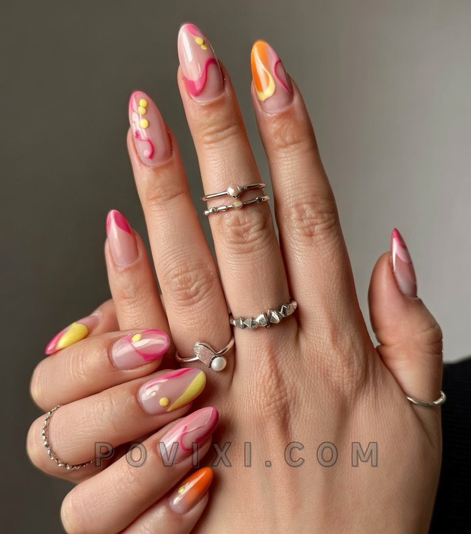 This look is like a vacation in a bottle: playful, funky, and totally made for the gram. Swirls of pink, orange, and lemon yellow wind across each finger in abstract, fluid shapes—almost like watercolor meeting graffiti art. The almond shape flatters most hand types, and the transparent base lets the swirls take center stage. This style is perfect for black women who want bold, expressive color combinations or any fashionista planning a girls’ trip filled with laughter, cocktails, and creativity.