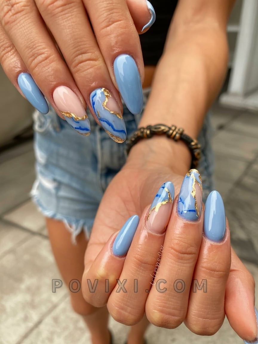 These nails feel like a mini spa day for your hands. Subtle marbled blue swirls with gold accents mirror foamy surf meeting sunlit shores, making them a calming, classy choice for a quiet retreat or honeymoon on a tropical island. The square shape adds a modern edge to this otherwise serene palette, while the glossy topcoat offers that fresh-off-the-salon glow. It’s minimalist-meets-luxury, perfect for those booking a stay at a wellness resort or Italy cliffside hideaway.