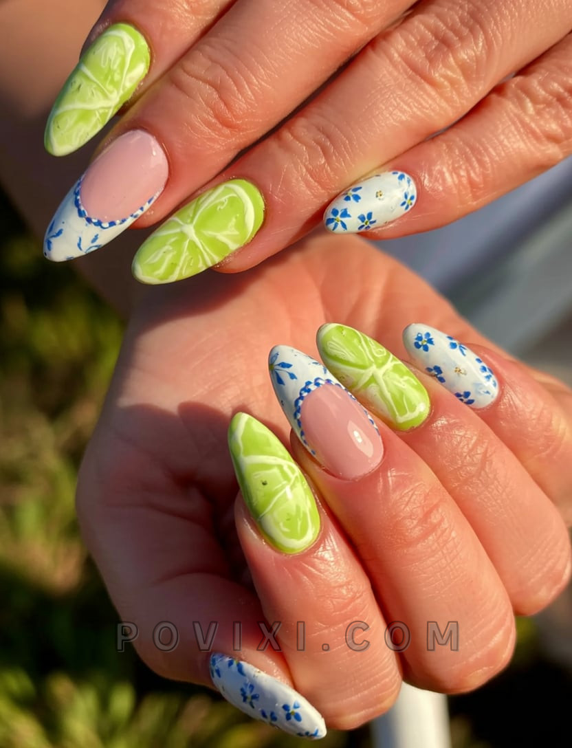 Fresh, citrusy, and delightfully artistic—this design is a perfect balance between simple and show-stopping. Lime green nail art slices are paired with intricate blue floral patterns on creamy porcelain-inspired tips. It feels like a summer brunch in Napa or a countryside stay in Provence. Ideal for long weekends filled with garden picnics and wine tastings, this look suits fans of detailed nail art who prefer natural nails aesthetics over anything too flashy.