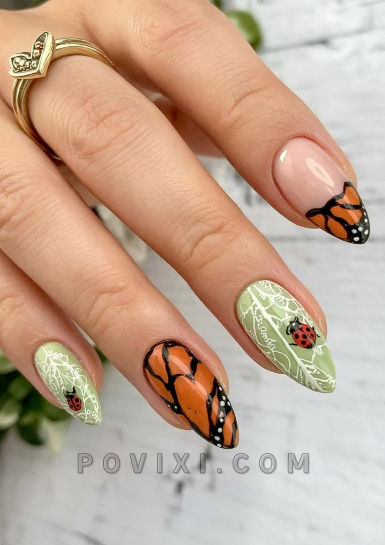 This is the manicure equivalent of wearing a sundress in a flower field. Detailed monarch butterfly wing tips are paired with dainty white lace lines and little red ladybugs. The gel nails offer dimension and durability, perfect for anyone planning hiking, wine tours, or even spring countryside getaways. Ideal for black women and lovers of delicate art alike, this design adds whimsy without sacrificing polish.