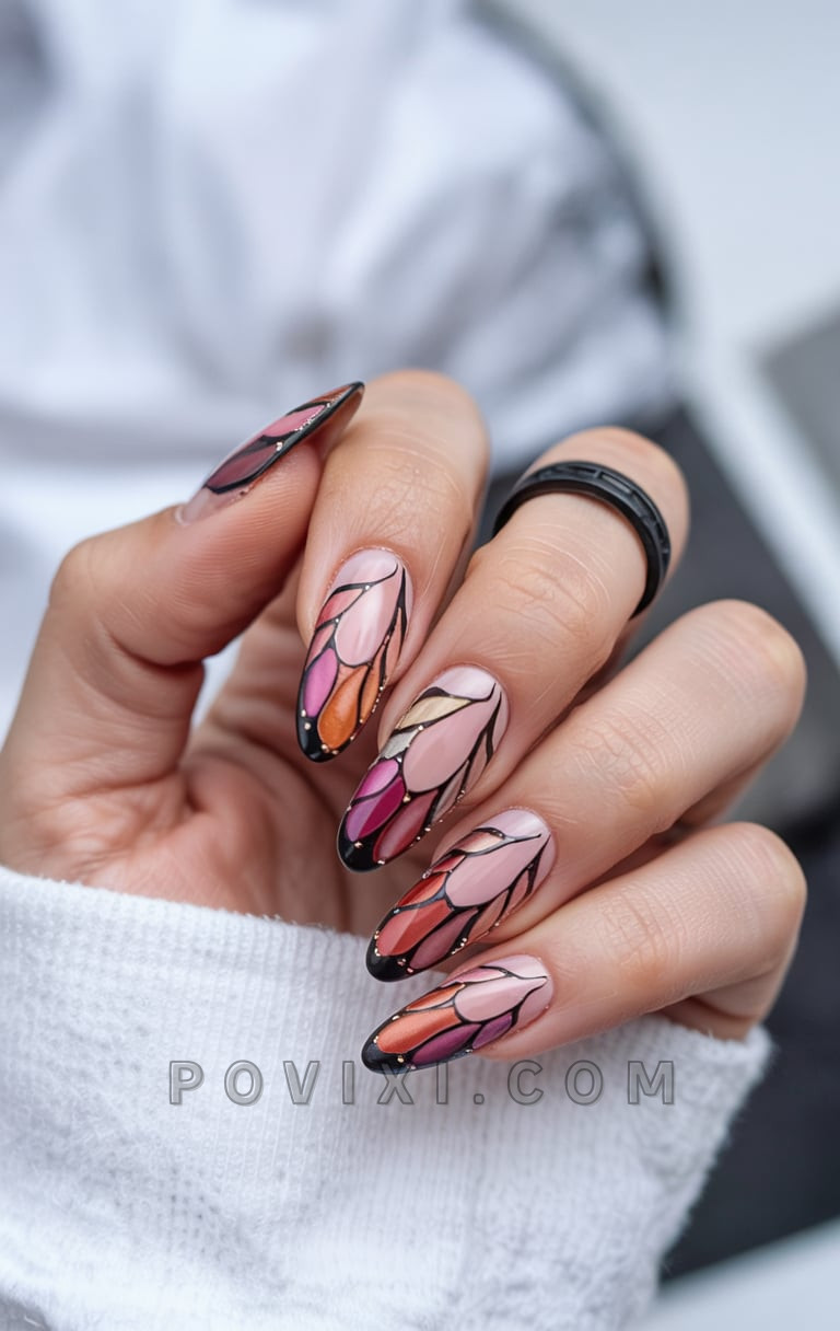 Bold and architectural, these almond shape nails channel stained glass windows with a butterfly-wing twist. The rich jewel tones of pink, wine, coral, and peach make these perfect for fall vacations, but they look stunning in every season. The black outlines add drama, while micro rhinestones placed between shapes provide subtle sparkle. Perfect for art lovers and those traveling for gallery hops or classy city escapes.
