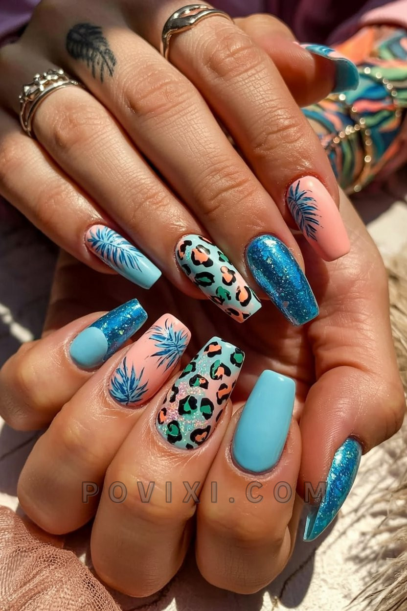 This one’s for the funky soul: vibrant blue glitter, tropical leaf silhouettes, and playful leopard print over candy-colored bases. If your vacation plans include beach bars, island hopping, or dancing under fairy lights, this is the nail vibe for you. The bold square shape enhances the fun of the design while making a fashion-forward statement.
